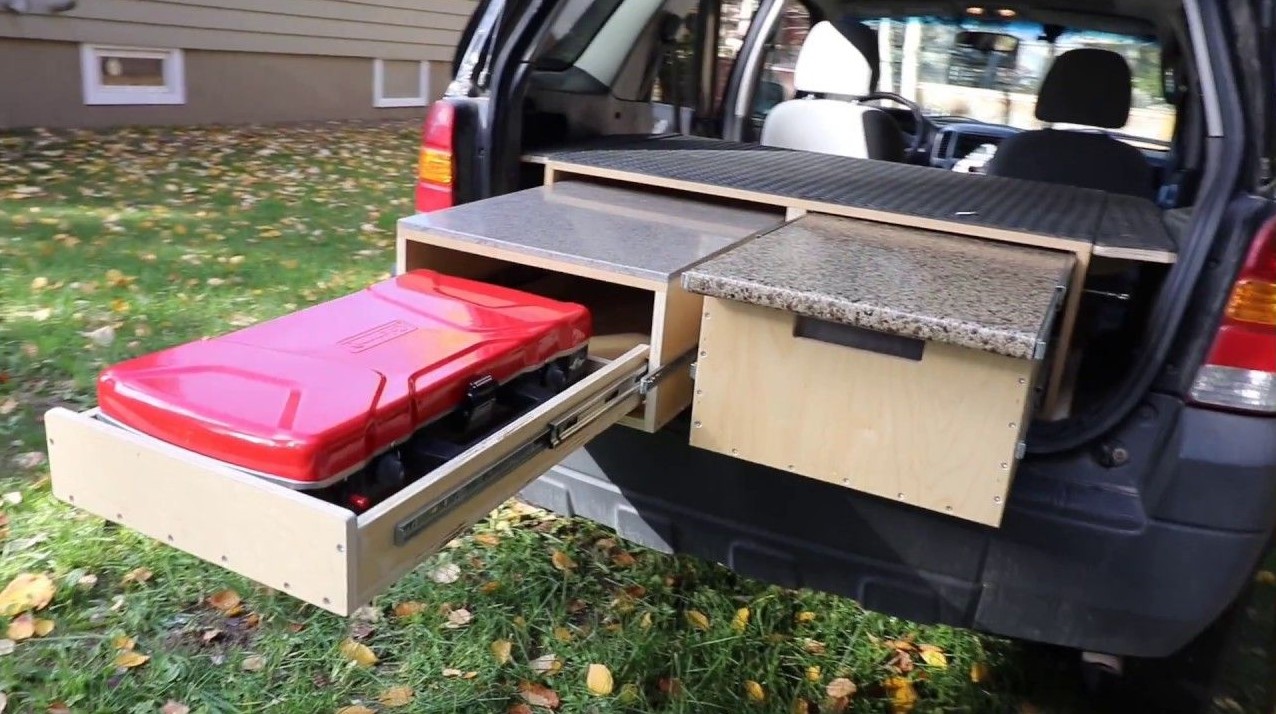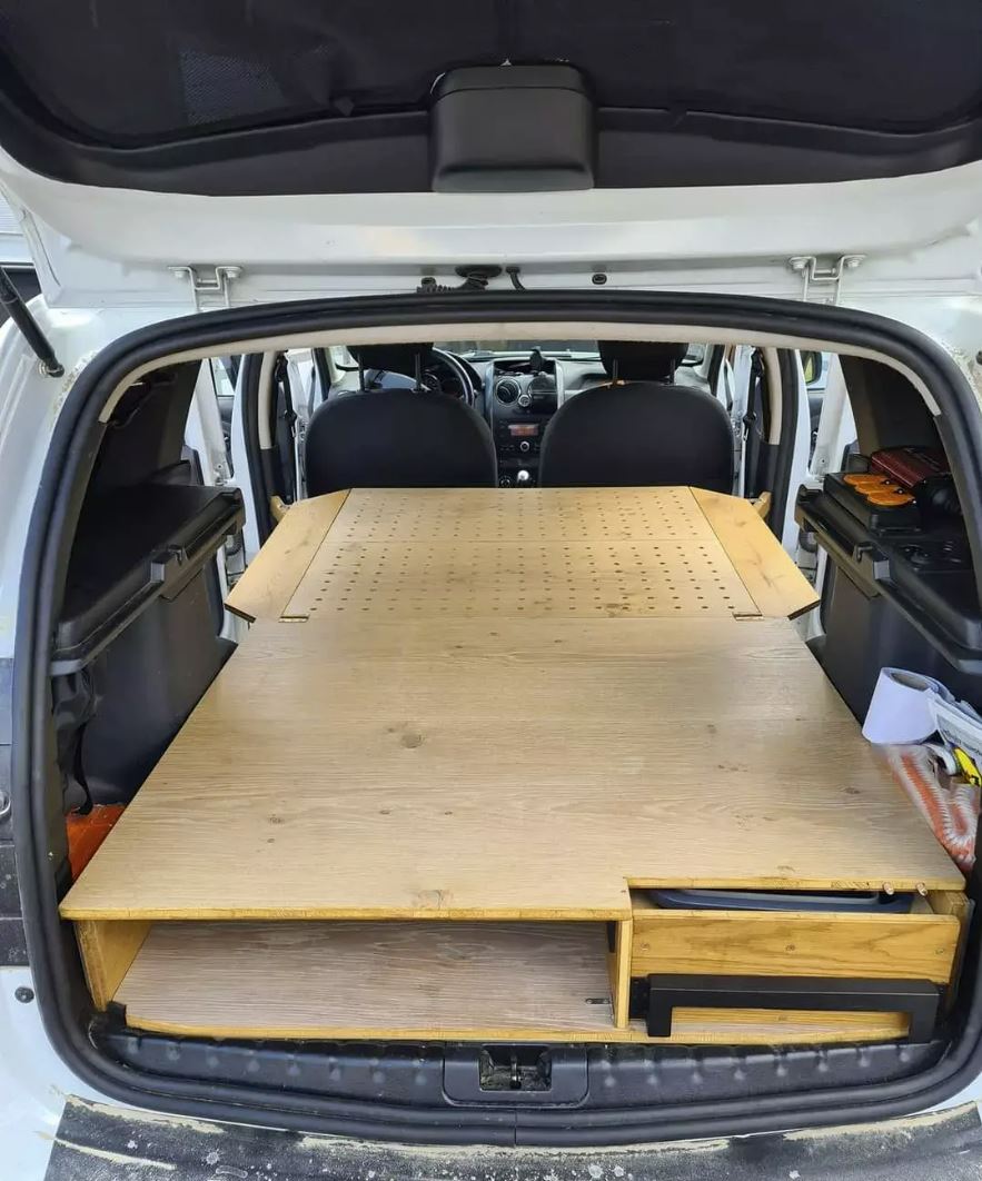 Den Ausbau wollte ich ganz einfach halten. Eine Pritsche um mit einer Matratze gerade zu liegen, eine Kühlbox, etwas Stauraum für das Nötigste. Fertig,