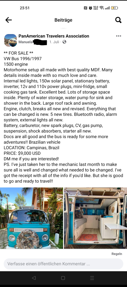 Als ich diesen einen Post von Manuela aus São Paulo, Brasilien fand, schlug mein Herz hoher und ich war „verliebt“. Ich wusste bis zu diesem Zeitpunkt nicht, dass ich einen Van/ausgebauten Bus brauchte, als ich ihn jedoch sah, wusste ich: *ICH WILL IHN!*