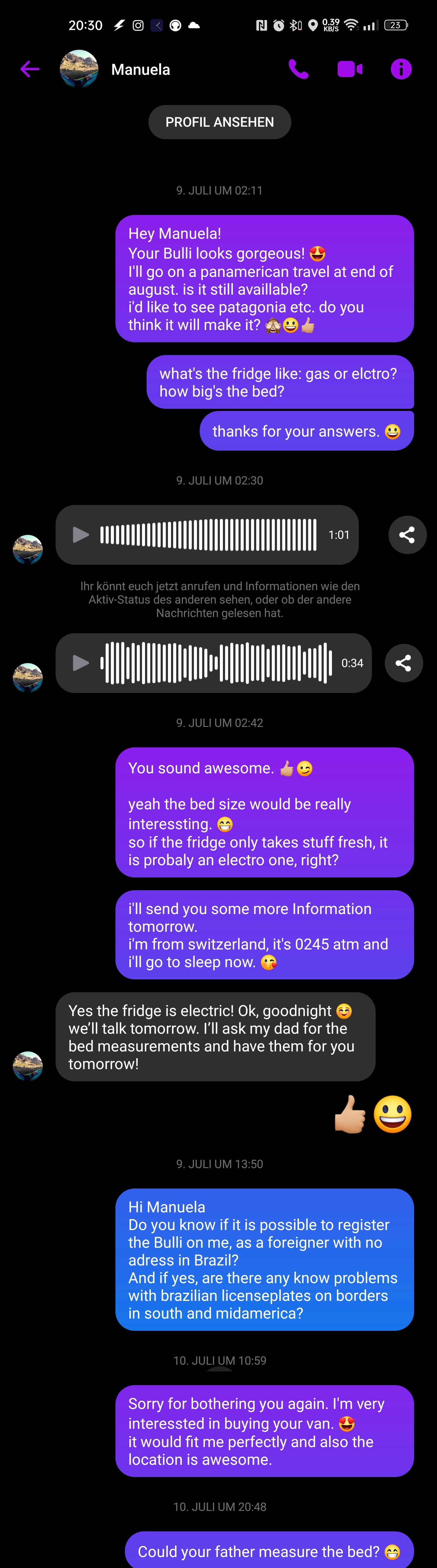 Schon am nächsten Morgen hatte ich eine sehr nette Sprachnachricht von ihr, in welcher sie erklärte, dass „sie“ (=der Bulli) grundsätzlich noch verfügbar sei, aber es noch ein anderes Paar gäbe, welches auch interessiert sei und „sie“ es lieben würde nach Patagonien zu fahren. Tönt komisch, ich wollte aber sichergehen, dass ich überall durchkomme mit dem Bulli. Da ich ja gerade deswegen unteranderem ein SUV/4×4 kaufen wollte.