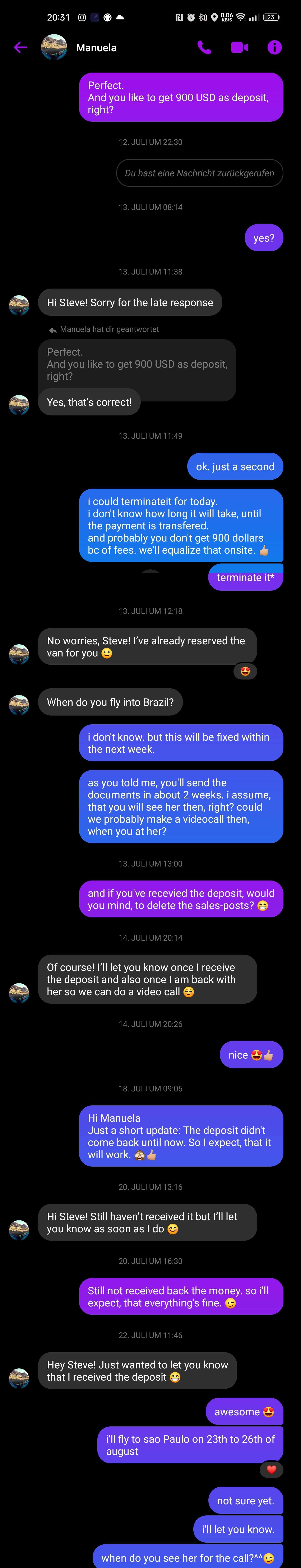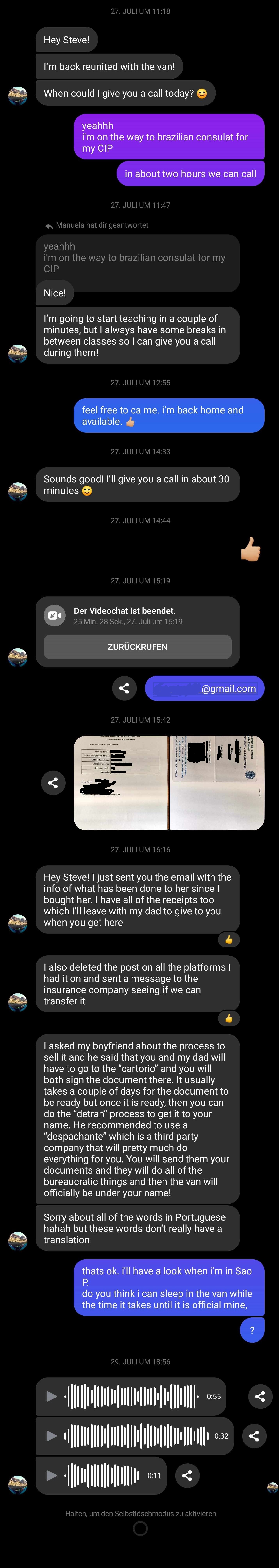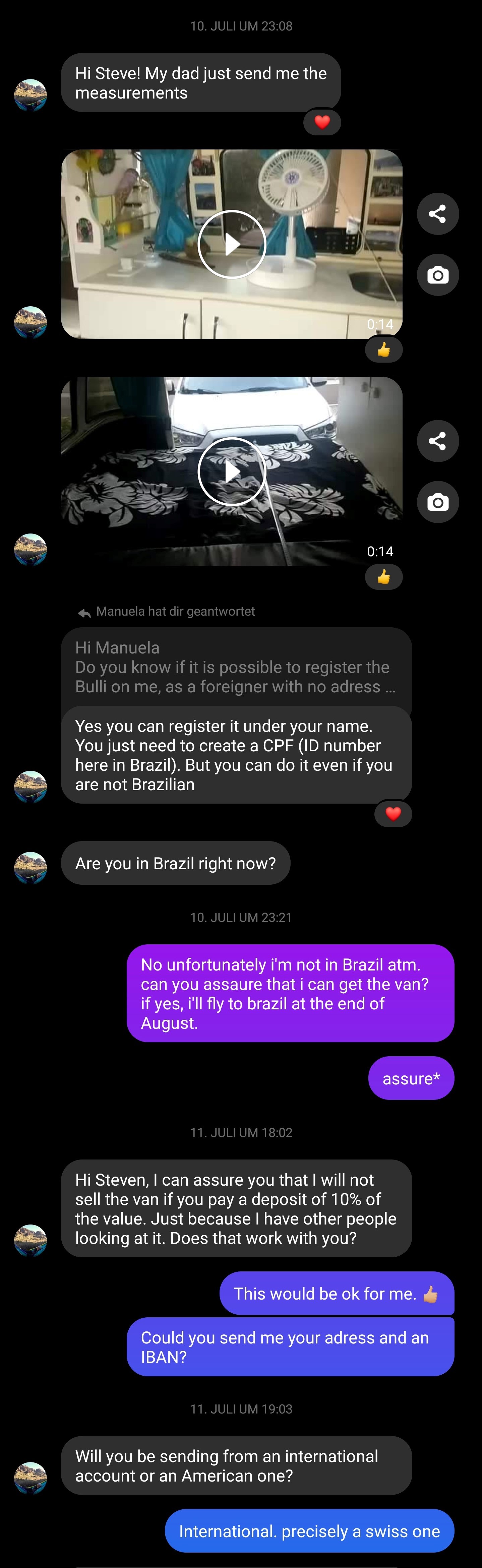 Ihre Bemühungen für mich, dass ich eine Zahlung auf eine IBAN leisten kann, überzeugten mich immer mehr, dass es sich bei dem angebotenen Bulli wirklich um einen physisch-vorhandenen Van handelt.