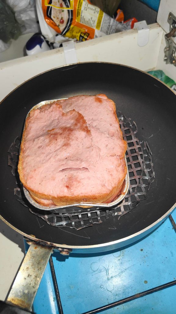 Den Fleischkäse habe ich in der Werkstatt einmal in meinem neu erfundenen „Umluftofen“ (ein Gitter in der Pfanne) gebraten.