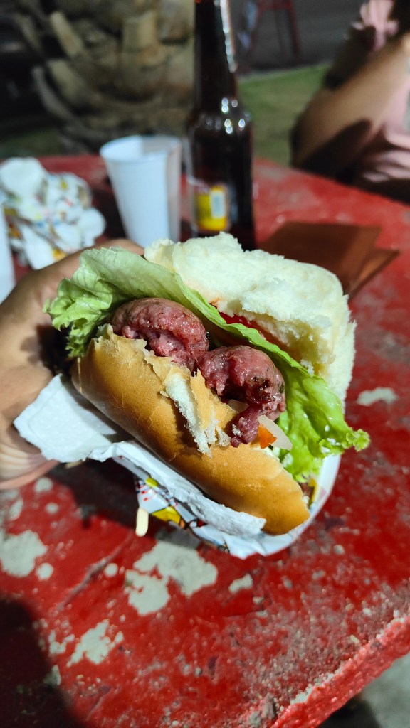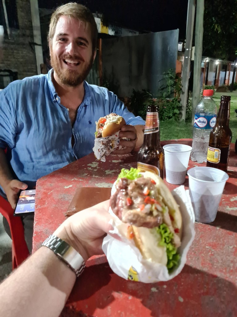 Wir hielten also an, und uns wurde da ein sehr leckeres Lomito (Brot mit Schnitzel) und Choripan (Brot mit aufgeschnittener Wurst) serviert. Mega cool!.