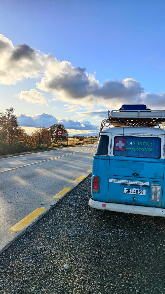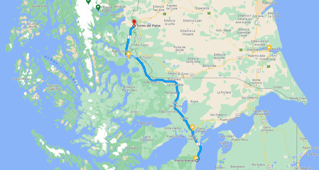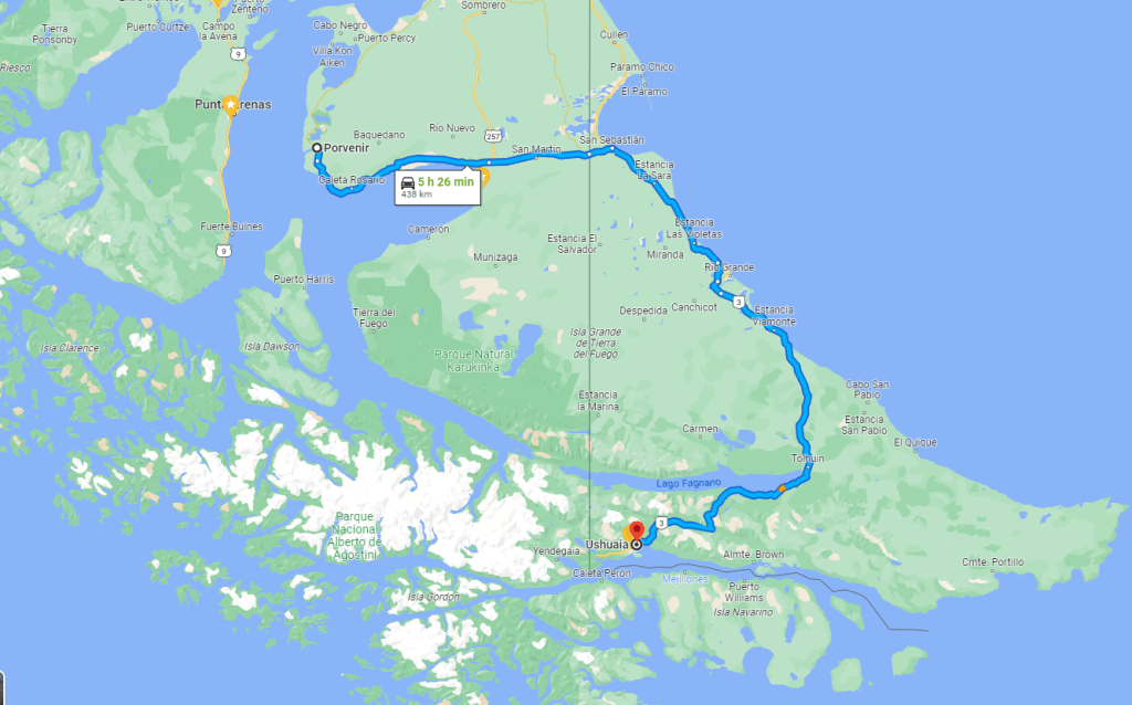 Via Rio Grande AR, nach Povenir CL mit der Fähre durch die Magellanstrasse nach Punta Arenas CL und von dort in den Nationalpark Torres del Paine.