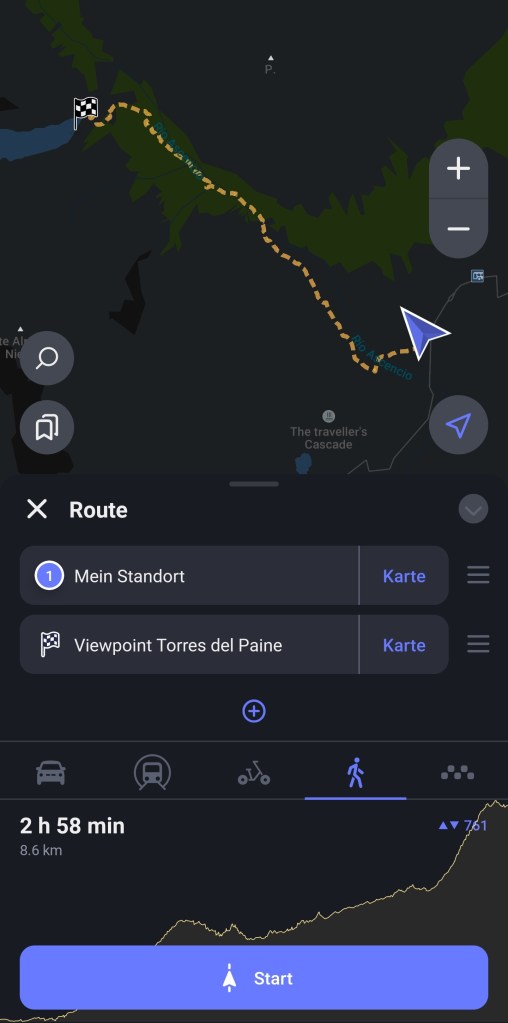 Am vierten Tag machte ich mich früh morgens auf den Weg zum „Mirador Base del Torres“. Die Wanderung sollte zu Beginn rel. einfach sein, aber für den letzten Kilometer ist auf der Karte eine Stunde eingetragen, was schon etwas zu verheissen mag.