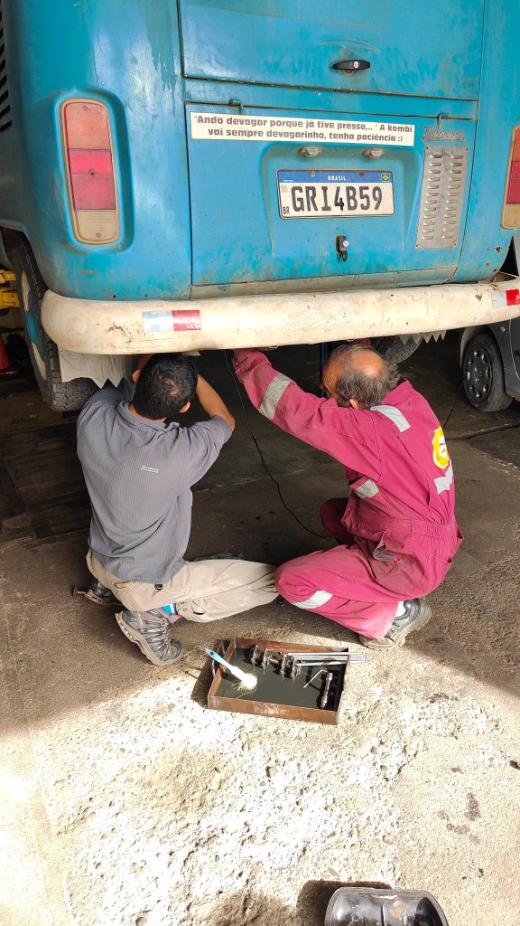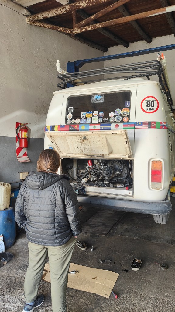 Auf der Suche nach einem Mechaniker, fanden wir vor einer Werkstatt Silvia, welche mit Ihrem Bulli auch auf die Rückkehr aus der Siesta der Mechs wartete.