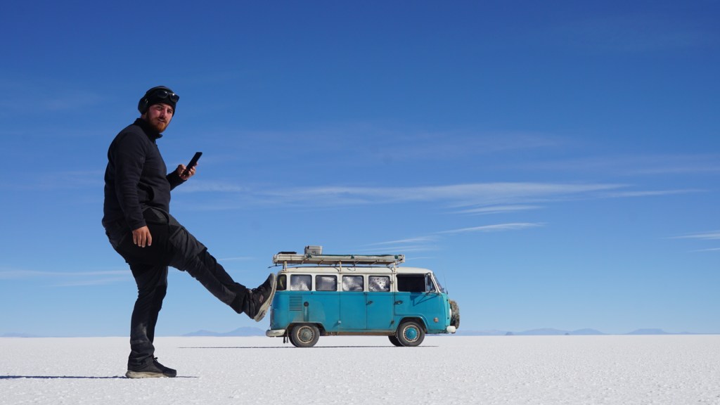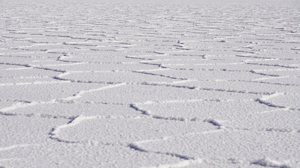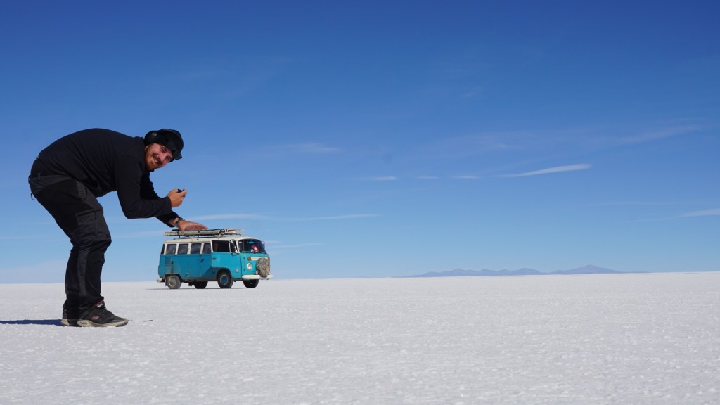 Etwas so Langweiliges und doch zutiefst Faszinierendes habe ich noch nie erlebt. Im Winter ist Trockenzeit. Das heisst das Salz ist meist tief weiss und steinhart. Einzig wo die meisten Autos langfahren, ist das Salz etwas verfärbt. Ansonsten weiss, weiss, weiss soweit man schaut.